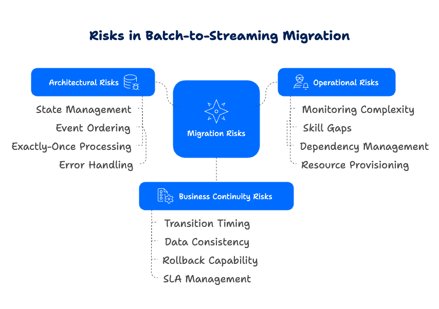 Successful batch-to-streaming migrations must address three primary risk categories: